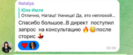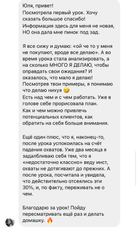 Юлия показывает, в чём пробелы именно у вас, куда двигаться, какие действия делать, какие уроки посмотреть, а какие можно пропустить, чтобы не терять время. - 6 созвонов с VIP-наставником, опытным маркетологом